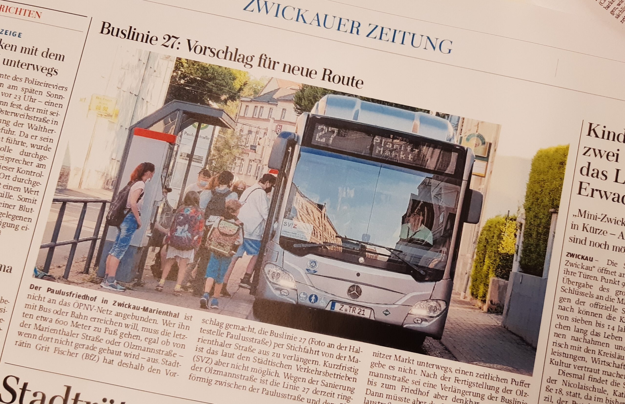 „Aktuell verkehrt die Linie 27 als Ringlinie, zwischen Paulusstraße und Planitz Markt. Das bedeutet, dass die Haltestelle Paulusstraße nur eine Durchfahrtshaltestelle ist und keine Wendezeiten zur Verfügung stehen.