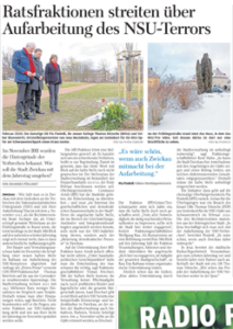 Menschen aus der ganzen Bundesrepublik haben durch vielfältige Aktivitäten und hohe finanzielle Aufwendungen in beispielhafter Art und Weise eine Erinnerungs- und Gedenkkultur zu diesem Thema etabliert. Diese wird von der Bürgerschaft in Zwickau und verschiedensten Initiativen, Parteien, Vereinen und Organisationen weitergeführt. Das Engagement bündelt sich z.B. im Zwickauer „Bündnis für Demokratie und Toleranz“, dem auch wir angehören, welches die Stadt unter anderem mit der Finanzierung von Stellen im Koordinierungsbüro im Alten Gasometer unterstützt.