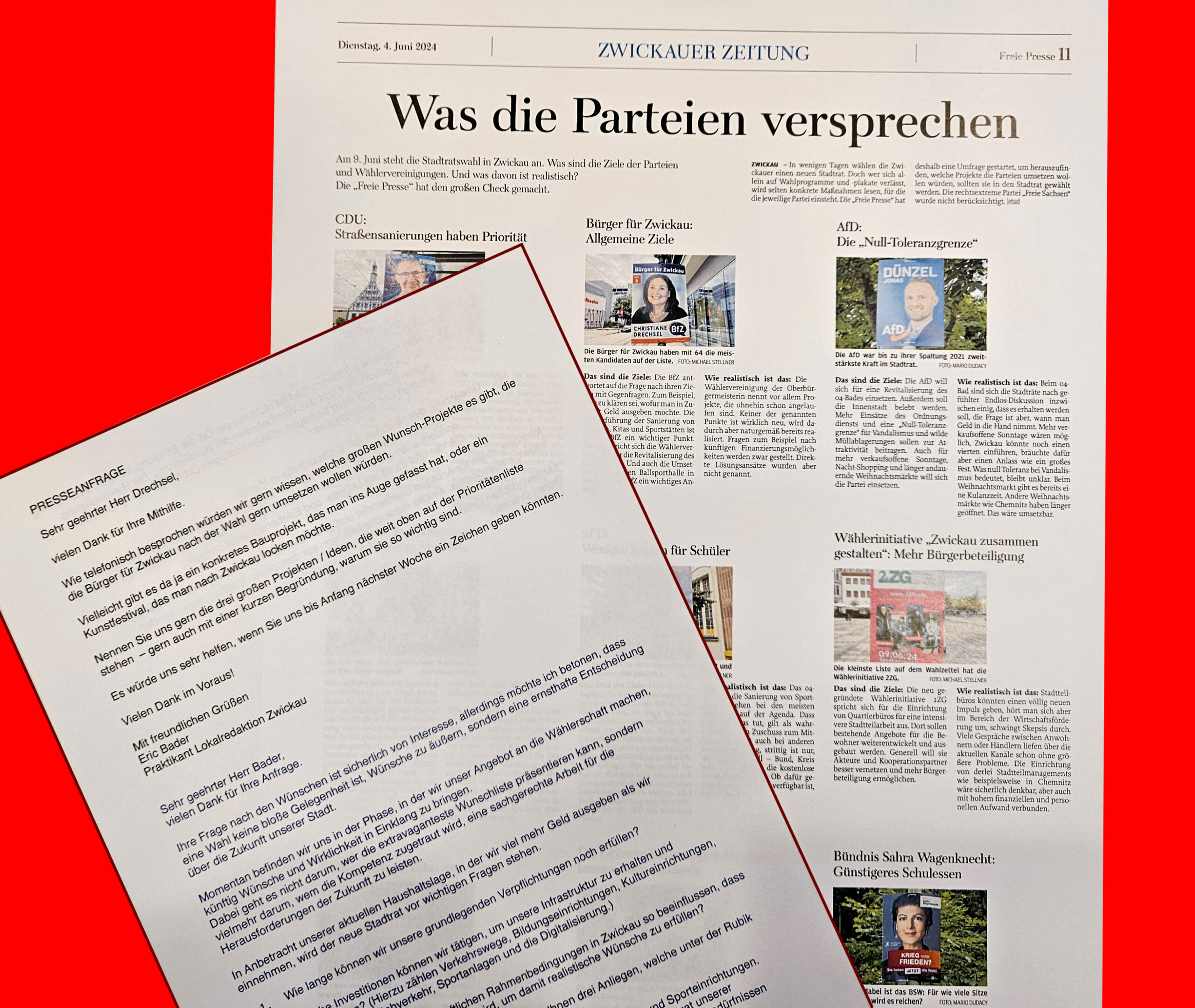 vielen Dank für Ihre Mithilfe. Wie telefonisch besprochen würden wir gern wissen, welche großen Wunsch-Projekte es gibt, die die Bürger für Zwickau nach der Wahl gern umsetzen wollen würden. Vielleicht gibt es da ja ein konkretes Bauprojekt, das man ins Auge gefasst hat, oder ein Kunstfestival, das man nach Zwickau locken möchte.