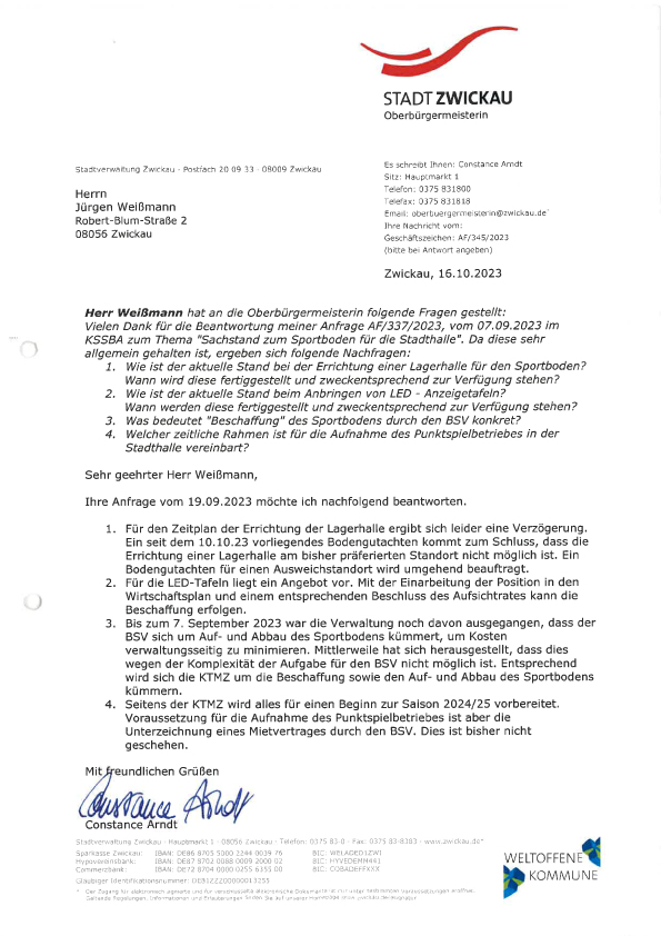 Der Sachkundige Einwohner der BfZ im BVA Jürgen Weißmann hat sich bei der Oberbürgermeisterin für die beantwortete Anfrage zum „Sachstand Sportboden in der Stadthalle“ bedankt. Da diese sehr allgemein gehalten ist, ergeben sich jedoch folgende Nachfragen: