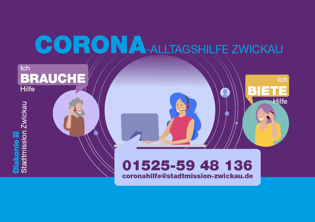 Zum 6. April startet die Diakonie Stadtmission Zwickau das Projekt „Corona-Alltagshilfe“. Hier finden Helfer und Hilfesuchende zusammen. Ziel ist es, für Risikogruppen eine kostenfreie außerhäusliche Hilfe zu organisieren. Die vermittelten ehrenamtlichen Helfer können beispielsweise Einkäufe, Wege zur Apotheke oder andere Botengänge übernehmen.