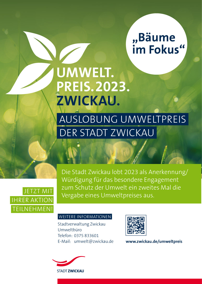 Die Stadt Zwickau lobt 2023 zum zweiten Mal als Anerkennung und Würdigung für das besondere Engagement zum Schutz der Umwelt einen Umweltpreis aus. Gesucht werden in diesem Jahr unter dem Motto „Bäume im Fokus“ konkrete Maßnahmen oder Projekte, die freiwillig und ohne Verpflichtung nachhaltig den vorhandenen Baumbestand in der Stadt Zwickau sichern, verbessern oder erweitern.